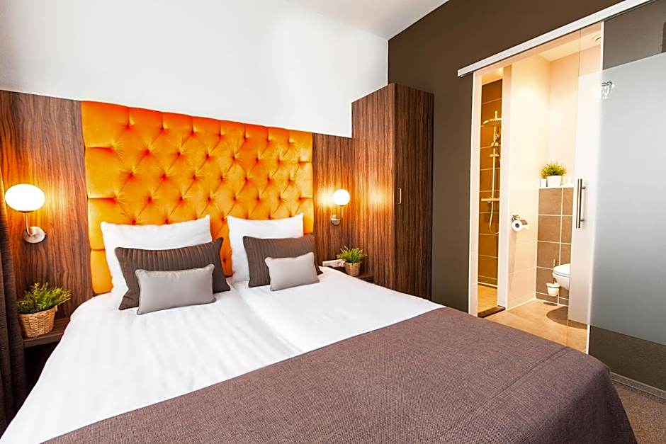 Modern rooms with box-spring beds, a work desk and a flat-screen TV.